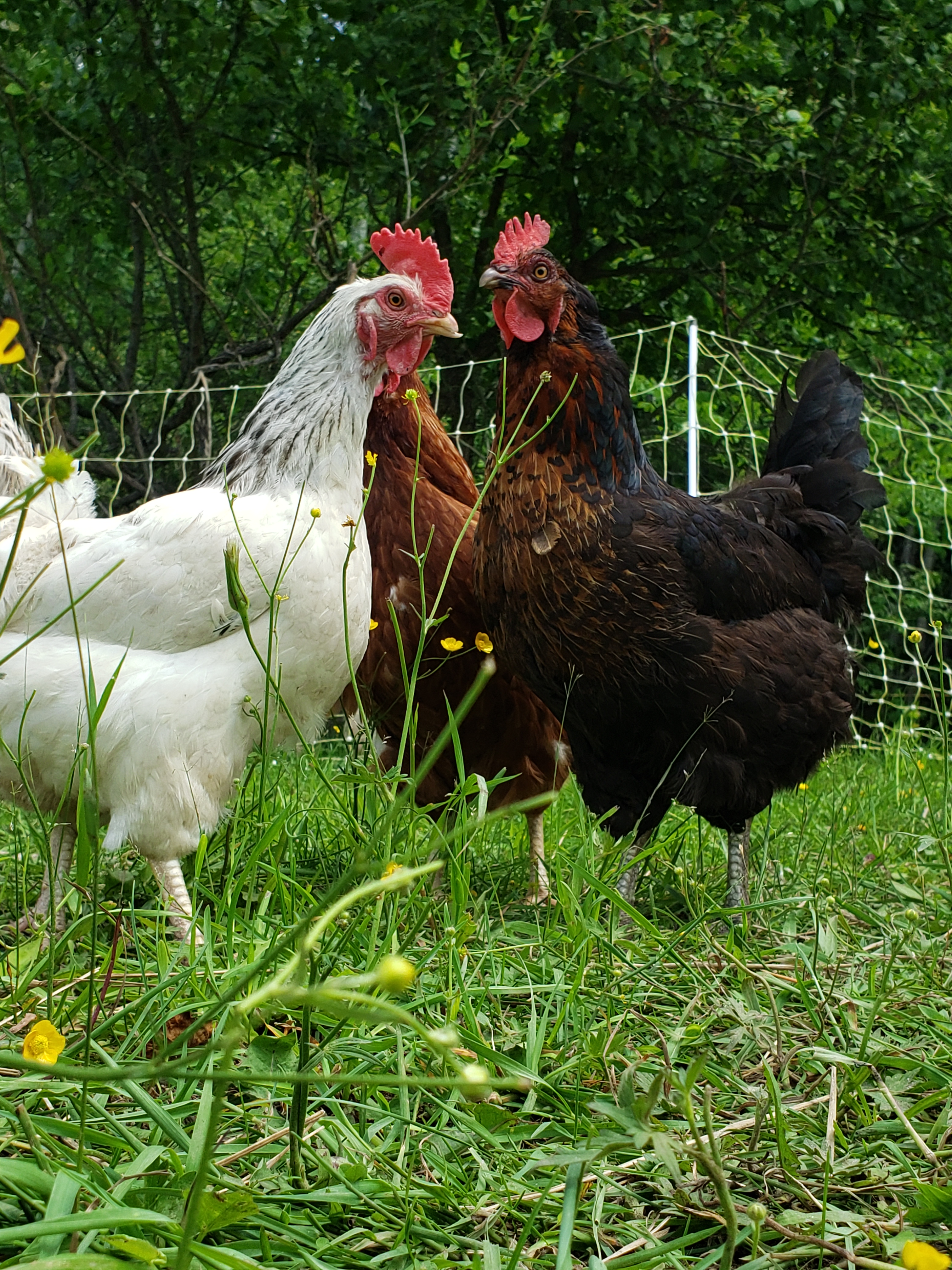 Our chickens are raised on pasture during the spring, summer and fall. Using a mobile coop along with portable fencing we can rotate the chickens to different areas and pastures. Allowing a fresh selection of forage, all while protecting the chickens from predators and improving the soil. The chickens are content to exhibit their natural instincts and provide nutritious eggs with bright yellow yokes.