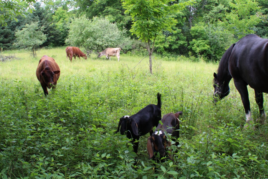 When we bought this land in 2015, it hadn’t been farmed in over 40 years. With its unique characteristics, this land doesn’t suit well to modern agriculture. It consists of 92 acres, most of which is forest, with a mix of both hard and softwood. A large wetland occupies the very back. There is a large ridge that runs on either side of our property and provides amazing views of the surrounding landscape. Existing fields and pastures could vaguely be identified by old fences that ceased to stand. Eastern red cedars grew so thick in the old fields, it made it difficult to walk through. It was only after we had moved that we found a small pond in the back, and an old barn foundation hidden among sumac. Old rusty farm implements, still can be found buried under debris. Apple trees line either side of our driveway and are planted along trails on the property. Wild apple trees still dot the pastures. They provide welcome shade for our cows and horse from the hot summer sun, as well as tasty treats in the fall. Pear trees are planted along our farm lane, which allows access to the back fields and woods. The pears themselves are small, round and hard, until a frost softens them. In spring, the trees are ablaze with color and sounds, as local pollinating species, search for food within the blossoms. In autumn, the fallen pears make a rich sweet aroma. Hazelnuts, bittersweet vines, wild roses, and lilacs are just a few other features this land offers.